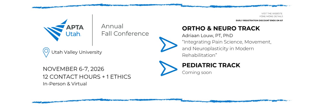 APTA Utah is recognized by the Department of Occupations & Licensing as an official accrediting body. If your organization is sponsoring a continuing education course, APTA Utah can approve your course for Continuing Education Units (CEU) that any attending PT's and PTA's can receive to apply towards their licensing requirements. Also, if you have taken a course and want to make sure it is approved for CEUs, we can help with that.